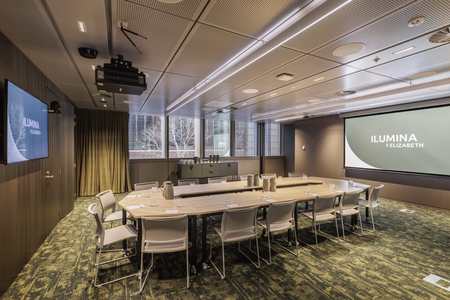 Built-in audio visual equipment including projection and video conferencing capability to support in-person and hybrid meetings