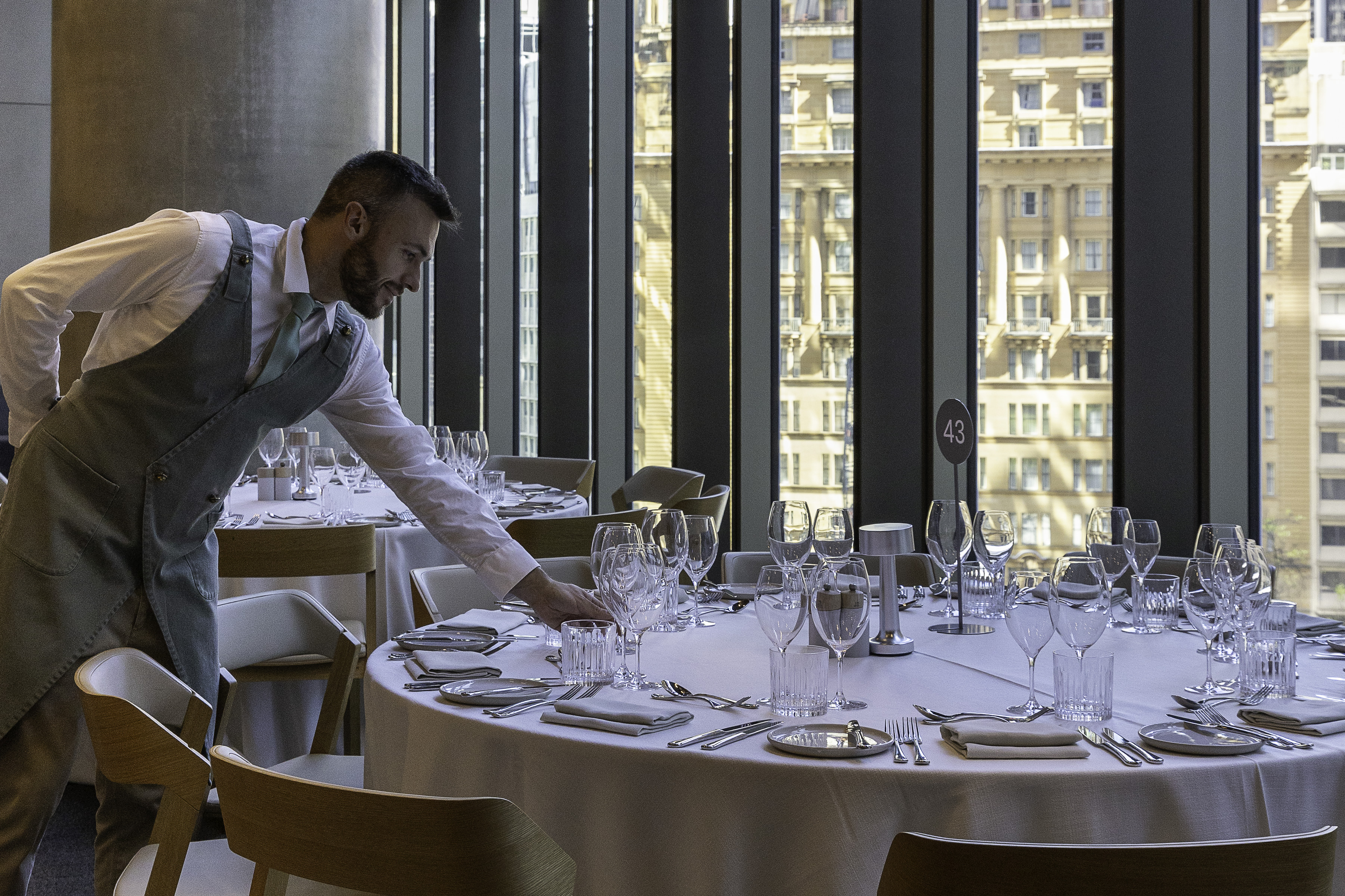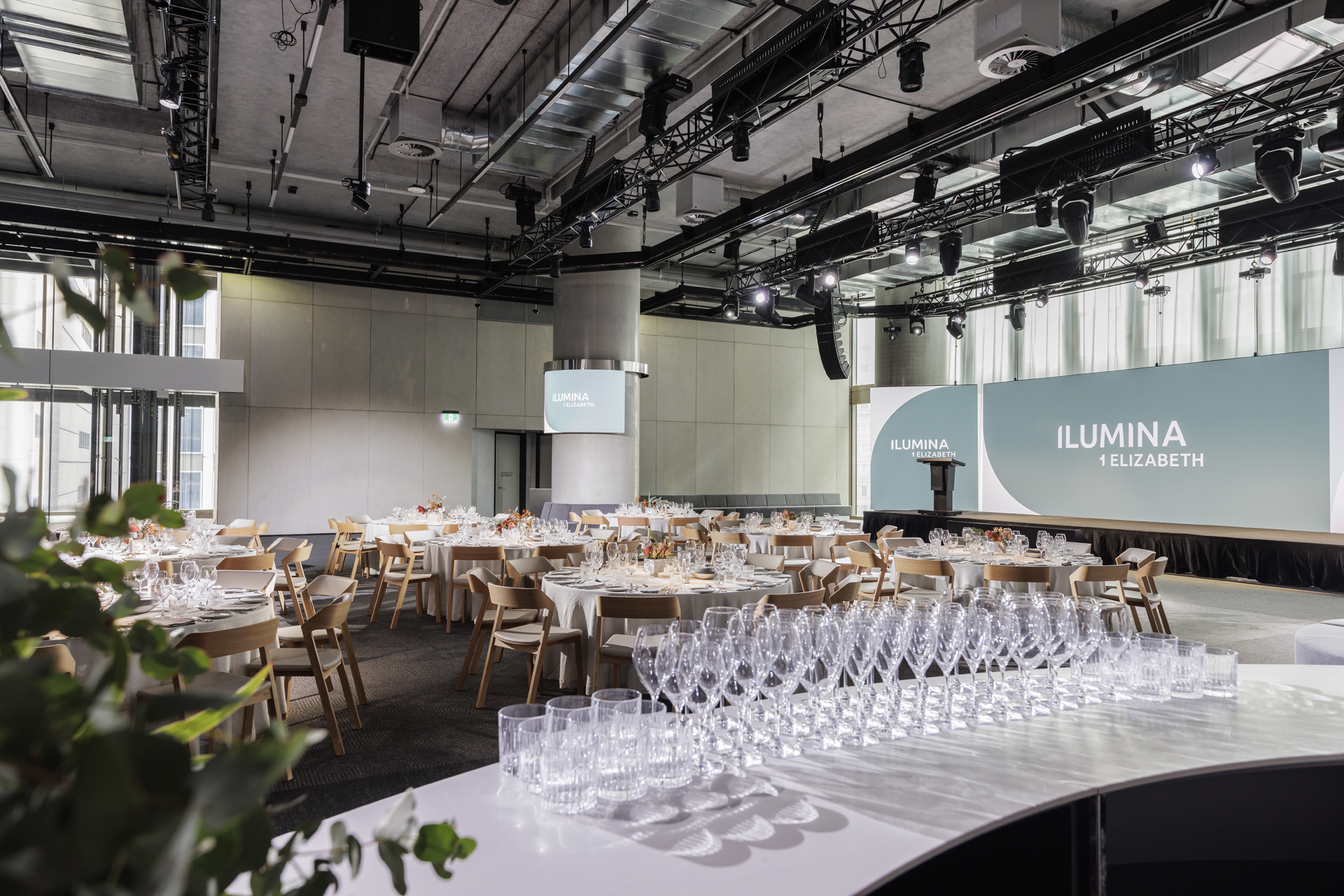 A double-height event space flooded with natural light on two sides, with views over Chifley Square to the north