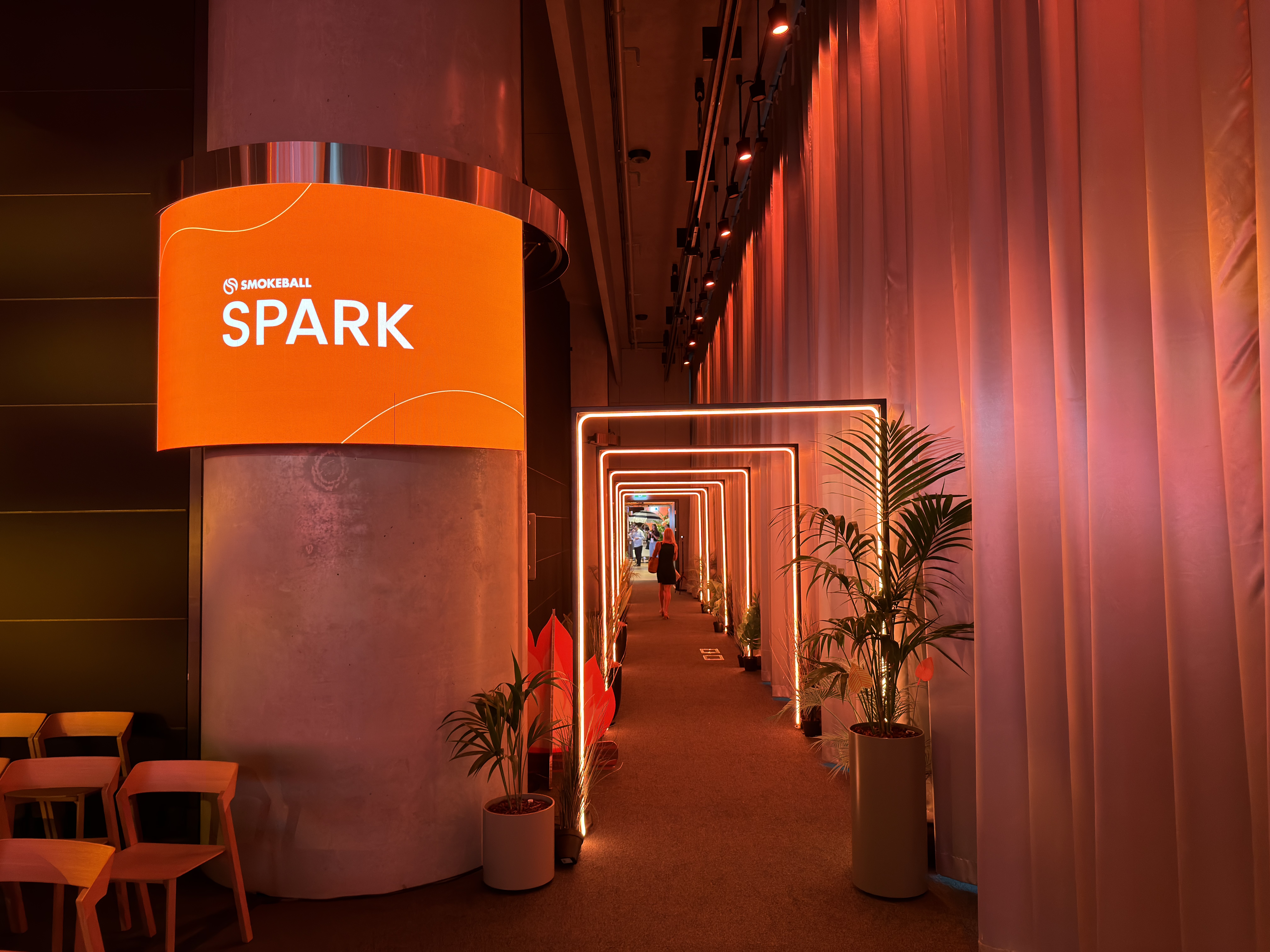 4 curved LED delay screens wrap the pillars in the space with rotational capabilities for optimal viewing angles